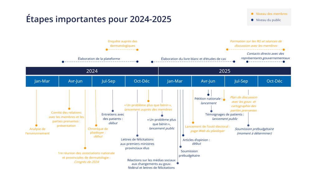 La publication de « Un problème plus que bénin » a marqué le début des efforts actuels de plaidoyer de l’ACD. Maintenant que la plateforme est établie, ce document permettra d’orienter et de représenter collectivement les priorités de l’organisation et de ses membres. Ce cycle électoral offre une occasion unique d’influencer positivement l’élaboration des politiques afin d’améliorer directement les soins dermatologiques et les résultats des patients canadiens.