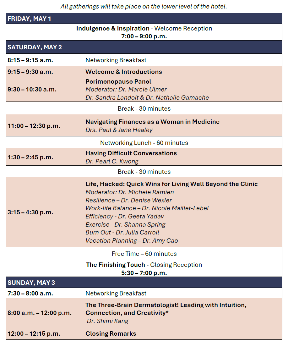 PROGRAMME Toutes les séances seront présentées en anglais seulement. Télécharger le programme (PDF) FORUM SUR LE LEADERSHIP DES FEMMES EN DERMATOLOGIE ATELIER D’UNE DEMI-JOURNÉE Dimanche 3 mai 2026 : de 8 h à midi Atelier sur la neurobiologie du leadership Les trois cerveaux des dermatologues! Un leadership fondé sur l’intuition, les liens et la créativité En savoir plus